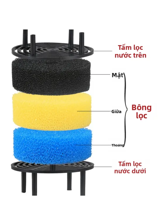 "Vì nuôi cá Chuột phân nhiều, các bác hãy để lớp bông lọc xanh (loại nhám) ở dưới cùng để giữ lại phân cá to, sau đó đến 2 lớp bông mịn ở trên để lọc bụi li ti nhé!"